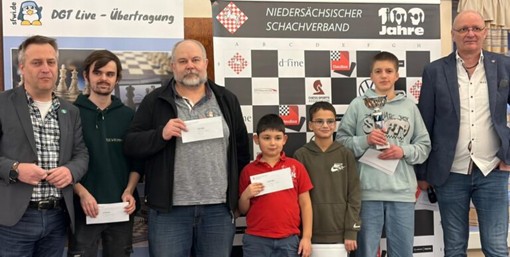 Für Andreas lief es nicht so prickelnd, so dass wir hier deshalb den Mantel des Schweigens darüber hüllen. Umso besser trug es sich dafür zu an den Brettern, die Daniels Welt bedeuteten. Mit 6,0/7 errang er ein Top-Ergebnis, das letztendlich Platz 2 in der Abschlusstabelle mündete. Herzlichen Glückwunsch! Nachstehend ein Bild von der Siegerehrung mit Daniel (Dritter von rechts).